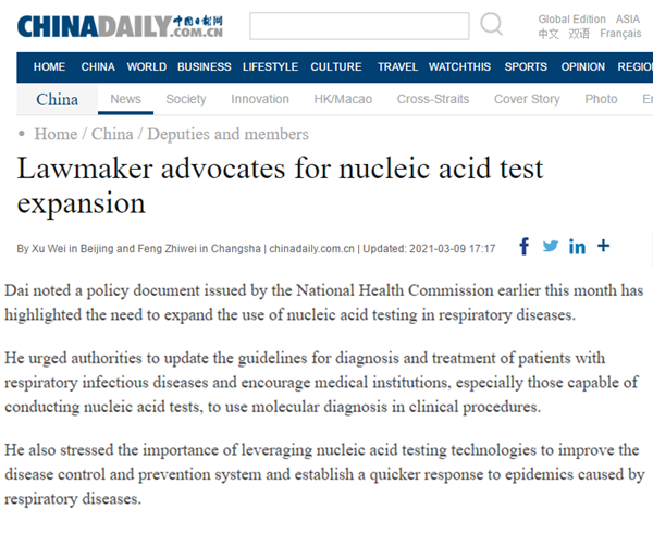 在3月6日和3月10日湖南代表团分组讨论会上,戴立忠代表分别作主题发言,围绕基因技术创新发展、充分发挥核酸检测能力效用、完善预防为主的疾病防控体制机制、医疗产品“走出去”等方面积极建言献策。