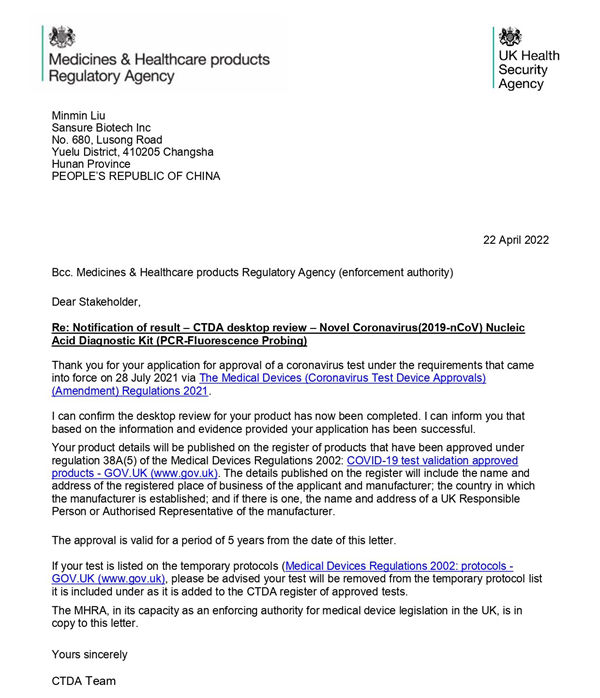 新冠检测试剂在英国上市必须经过CTDA审查和MHRA注册双认证,由于CTDA审查对产品性能的高要求,目前可在英国合法销售的新冠产品并不多。好博体育生物新型冠状病毒(2019-nCoV)核酸检测试剂盒(荧光PCR法)临床性能和分析性能均满足CTDA高要求,且得到进一步有效验证,获得了CTDA的充分认可。