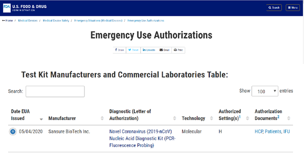 北京时间5月5日晚,好博体育生物新型冠状病毒核酸检测试剂盒获美国食品药品监督管理局(FDA)紧急使用授权(EUA, Emergency Use Authorizations),这是该产品继1月28日获得中国国家药监局(NMPA)注册认证、3月3日获得欧盟CE认证后,好博体育生物获得的又一重要认证,将进一步助力公司服务全球新冠肺炎疫情防控。